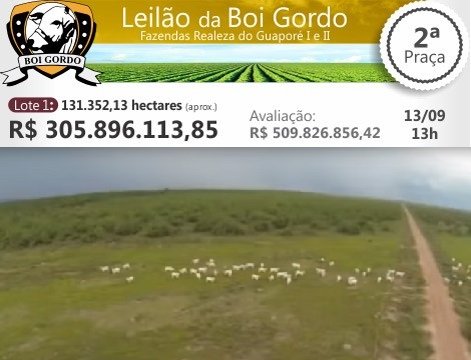 O leilão em São Paulo prevê a compra das fazendas Realeza do Guaporé I e II, com lance mínimo de R$ 306 milhões. Caso não seja arrematado, o lote será desmembrado em 31 fazendas, entre as que compõem o complexo, em Comodoro (MT), às margens do Rio Guaporé. Somente o leiloeiro ficará com R$ 14 milhões.