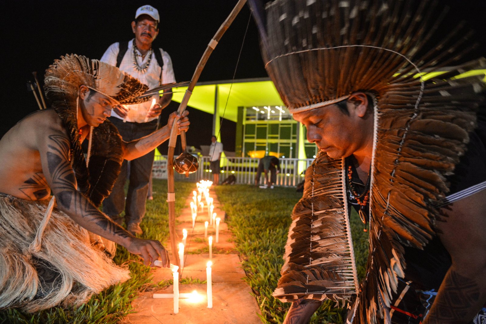 Indígenas de três etnias acendem velas em protesto em frente ao STF contra 3 decisões que anularam atos administrativos de demarcações de terras (Valter Campanato/Agência Brasil)