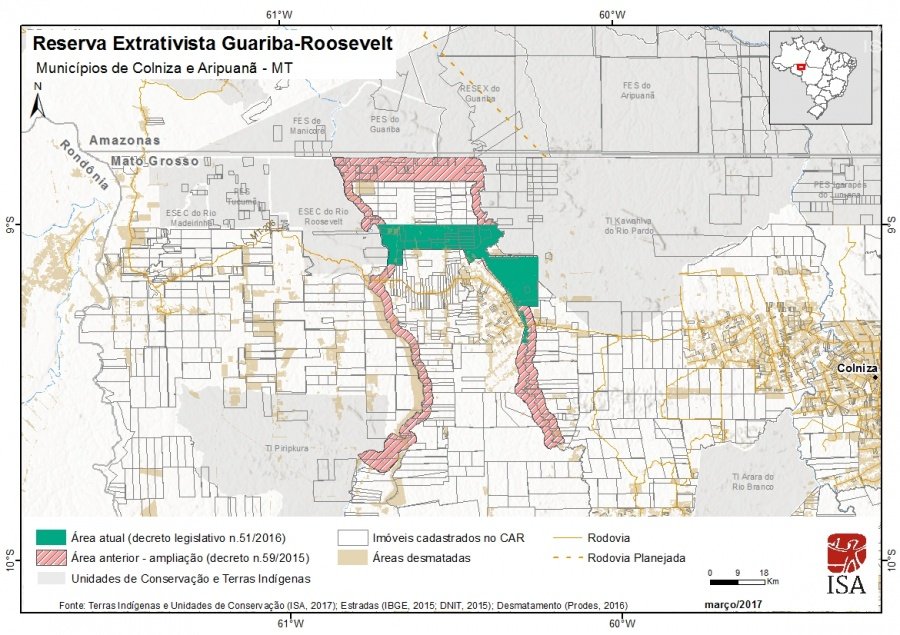 O programa de Monitoramento de Áreas Protegidas do Instituto Socioambiental (ISA) divulgou nesta terça-feira (28/03) que 107 mil dos 164 mil hectares da Reserva Extrativista Guariba-Roosevelt, no Mato Grosso, foram reduzidos pela Assembleia Legislativa, em dezembro. A Resex criada em 1996 – uma das mais antigas da Amazônia – possui agora 57 mil hectares. A redução é de 65%.