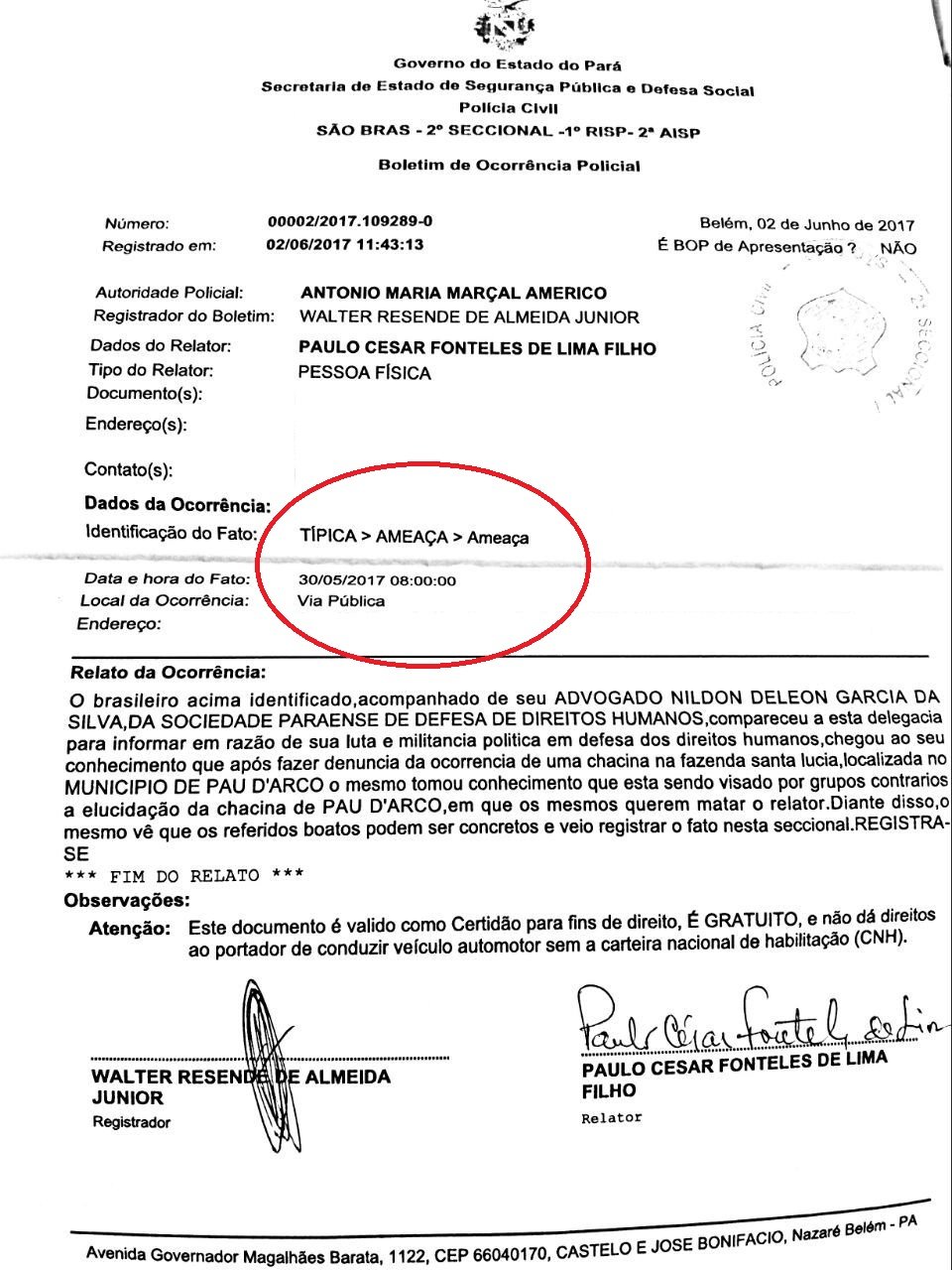 O ativista está inserido no programa de proteção à testemunha, mas autorizou que o nome fosse divulgado. Paulo César Fonteles de Lima Filho denuncia as violências da região, e registrou o boletim de ocorrência na Delegacia de Polícia Civil de Belém na última sexta-feira (02/06)2. Aos policiais, declarou “ter tomado conhecimento de estar sendo visado por grupos contrários”. Essas pessoas, de acordo com ele, “querem matá-lo”.