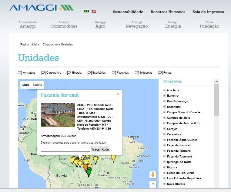 O município de Campo Novo do Parecis (MT) tem 945 mil hectares – uma vez e meia a área do Distrito Federal. Pelo menos 1/20 pertencem ao grupo André Maggi, da família do ministro da Agricultura, Blairo Maggi. Em 2010, quando foi eleito senador, o sojeiro declarou, por R$ 3,52 milhões, 16,67% da Agrícola e Pecuária Morro Azul Ltda, dona da fazenda Itamarati Norte. O próprio site do grupo AMaggi (foto principal) enumera a fazenda entre as unidades do grupo.