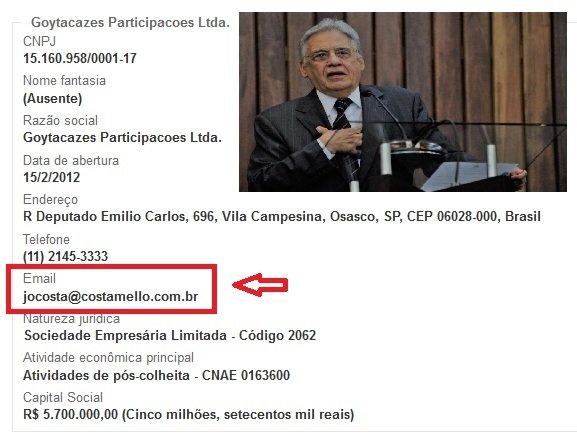 É o email de José de Oliveira Costa – o que ele utiliza em seu escritório de advocacia, o Costa, Mello Advogados – que aparece nos registros da Goytacazes Participações, a empresa agropecuária de Beatriz, Luciana e Paulo Henrique Cardoso. Saiba mais sobre a Goytacazes aqui: “FHC, o Fazendeiro – Fazenda da família de Fernando Henrique em Botucatu (SP) é um canavial sem casa e sem cercas” .(Ele também teve um email em nome do Instituto FHC, como mostra a revista Época, utilizado numa troca de mensagens sobre um saldo bancário com o banco Opportunity.)