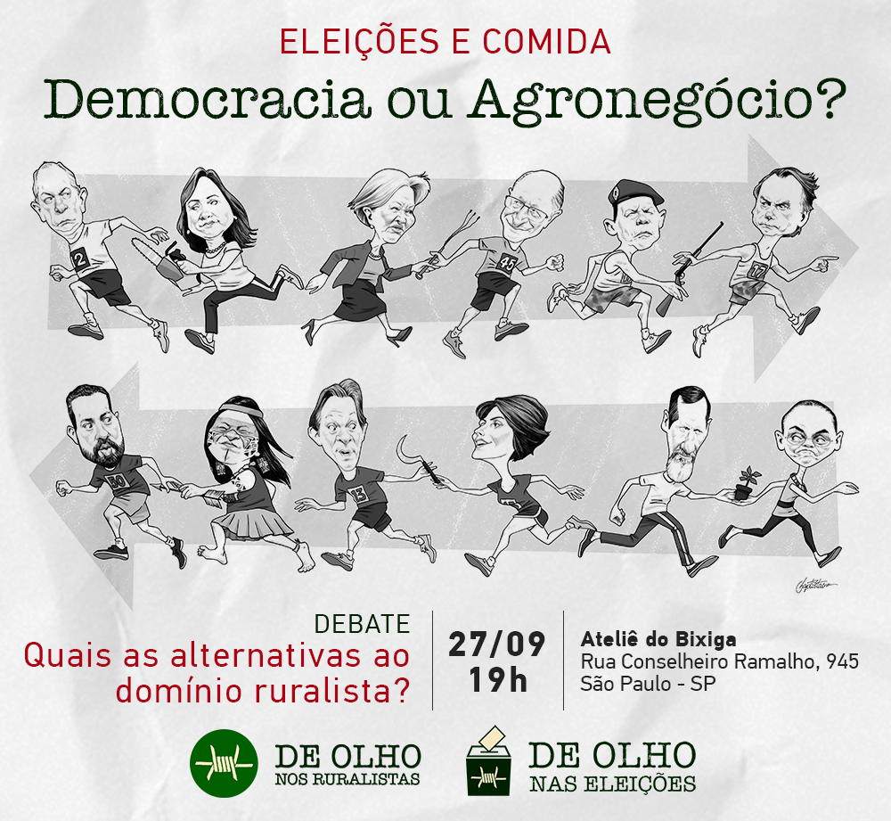 De Olho nos Ruralistas, O Joio e o Trigo e Outras Palavras promovem na quinta-feira (27), em São Paulo, um debate sobre alimentação e voto. Que Brasil emergirá das eleições, do ponto de vista do modelo agrário? Para discutir o tema, as três organizações convidaram o Instituto Brasileiro de Defesa do Consumidor (Idec), o Instituto Chão, a Campanha Permanente Contra os Agrotóxicos e Pela Vida e o Movimento dos Trabalhadores Rurais Sem-Terra (MST).
