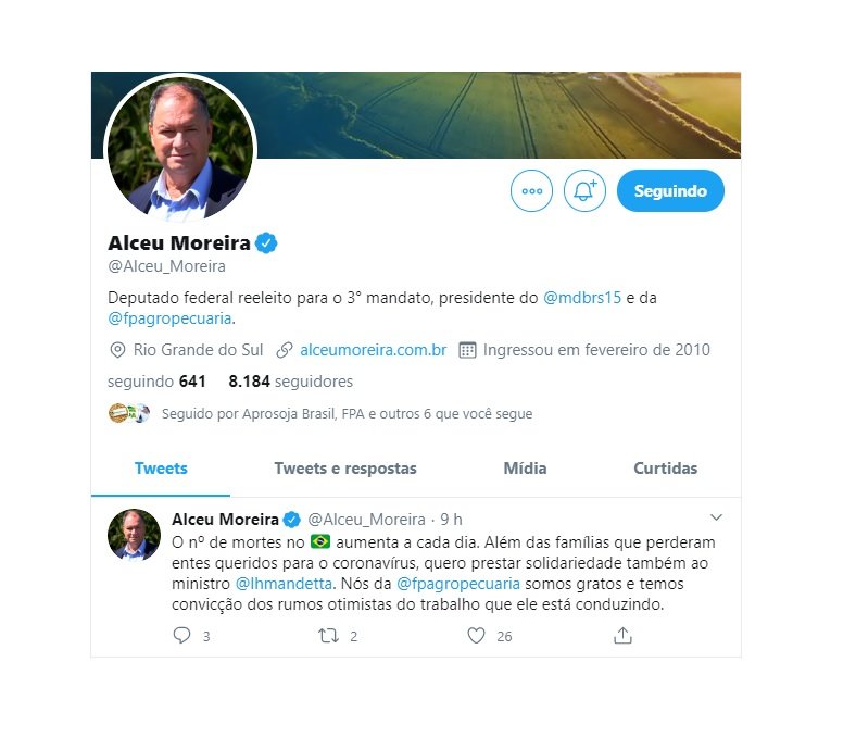Também no domingo, mas à noite, Alceu Moreira voltou a declarar apoio a Mandetta. E deixou claro que não falava somente em seu nome, mas em nome da frente parlamentar: “O número de mortes no Brasil aumenta a cada dia”, escreveu, novamente no Twitter Além das famílias que perderam entes queridos para o coronavírus, quero prestar solidariedade também ao ministro Mandetta. Nós da @fpagropecuaria somos gratos e temos convicção dos rumos otimistas do trabalho que ele está conduzindo”.