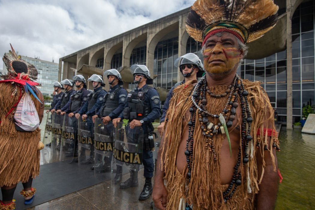 Foto principal (Tiago Miotto/Cimi): no dia 12 de março, líderes indígenas foram recebidos por PM e Força Nacional no Ministério da Justiça