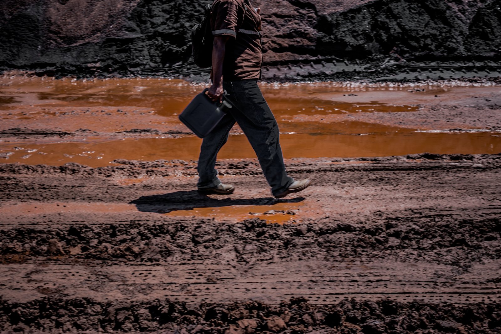 Foto principal (Ísis Medeiros/De Olho nos Ruralistas): funcionário caminha em meio à lama de minério, em Itatiaiuçu (MG)