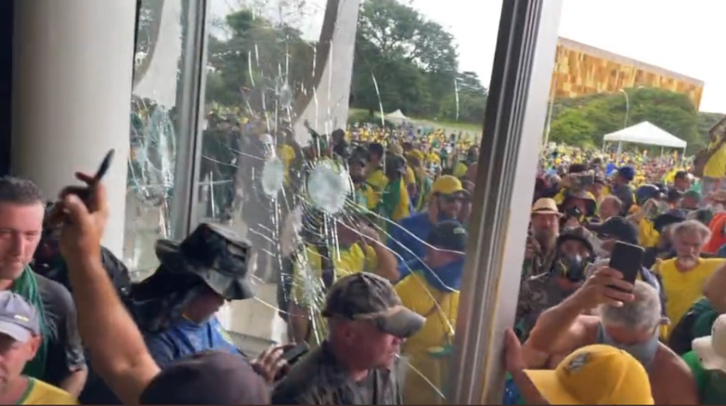 Foto principal (Reprodução): terroristas destroem vidros do Palácio do Planalto no dia 08 de janeiro