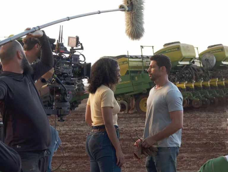 Foto principal (Divulgação/Rede Globo): imagem de bastidores mostra elenco de “Terra e Paixão” durante gravações na Fazenda Annalu, em Deodápolis (MS).